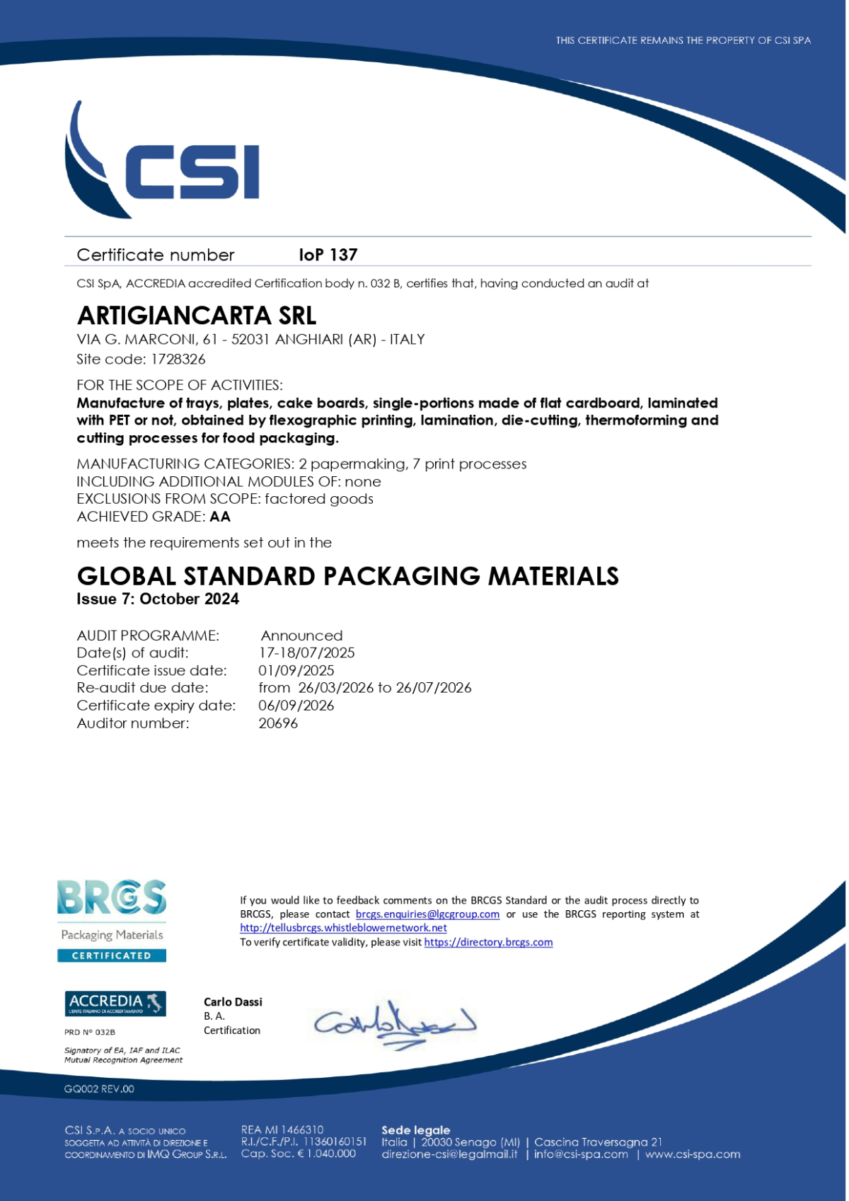 ArtigianCarta ha ottenuto la certificazione BRCGS Packaging, uno standard sviluppato dal British Retail Consortium (BRCGS), con il supporto dell’Institute of Packaging.